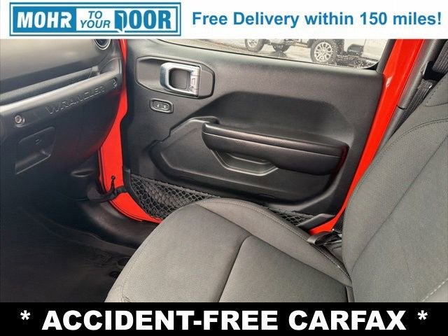 The exterior of this Wrangler Unlimited Sport S stands out with its bold, distinctive styling and eye-catching Orange paint. The premium features continue inside, where you'll find a well-appointed cabin with thoughtful amenities like a 7-inch touchscreen display, Apple CarPlay, Android Auto, and a premium audio system to keep you entertained on the go.