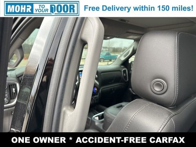 The sleek Black exterior is complemented by a wealth of chrome accents, including the grille, mirror caps, and wheel-to-wheel assist steps, giving this Silverado a bold and sophisticated appearance. Step inside, and you'll be greeted by a luxurious cabin featuring perforated leather-appointed seating, heated and ventilated front seats, and a power sunroof, creating an exceptional level of comfort and refinement.